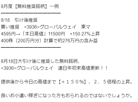 去年は連続で提供後に2銘柄とも5~10%を超える上昇となっています!そして後にも先にも、去年8月の最高のパフォーマンスをたたき出したのは、【3936】グローバルウェイですね!
