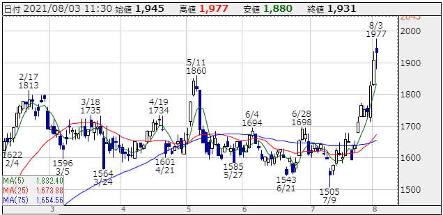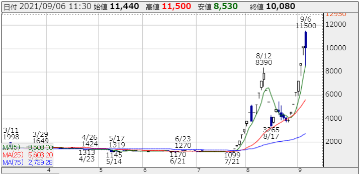 見事すぎる大暴騰となりましたが、この銘柄を推奨するのは半端ないですよ!8月はこの銘柄だけでも株価2倍超えていますからね!!