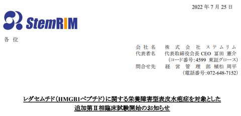 昨日記載の株 株提供の【4599】ステムリムですが、引け後にレダセムチド(HMGB1ペプチド)に関する栄養障害型表皮水疱症を対象とした 追加第Ⅱ相臨床試験開始とのIRが出て上昇となっています。