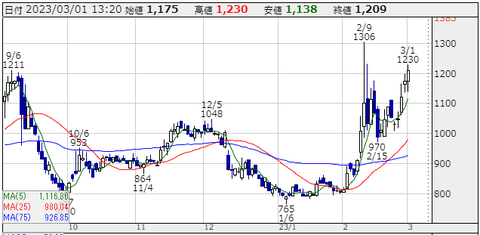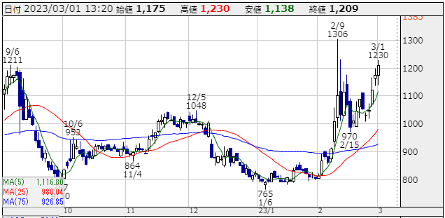 柱のAIソリューションが牽引。AI人材データベース活用し新規開拓に加え、既存顧客の継続取引拡大。対話型AI(人工知能)の「Chat(チャット)GPT」が秘める絶大なパワーも株価押し上げに貢献。ChatGPTのユーザー数は昨年11月下旬のローンチ以降、急拡大の一途にある。今年1月の月間アクティブユーザー数は約1億人に達したと推計されており、歴史上、最も速く成長したアプリケーションとなった。第2四半期の概況については「新型コロナウイルス感染症の影響をきっかけに進んだリモートワークの推進や各企業のデジタルトランスフォーメーション(DX)の推進は、感染症の影響が落ち着いても止まることなく、AIアルゴリズム実装に対する需要を高めている。22年2月17日に公開価格350円で新規上場、3月30日には1857円高値を付けた。その後は下落したが、23年1月6日に765円まで押してから底入れから上昇機運に転向している。ただし最安値からの底打ちでの反転のためかなり荒っぽい株価の動きになる模様なので投資の経験豊かな投資家向けと思われる。