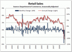 米商務省が14日発表した昨年12月の小売売上高(季節調整済み)は3432億ドル(約30兆5000億円)となり前月比2.7%減少した。2008年通年では0.1%減の4兆4783億ドル(約398兆6000億円)で現行統計が始まった1992年以来初めて前年を下回った。 年間ベースでの売上高は92年以降で最低の伸び率だった02年(2.4%増)を下回り、一気にマイナスに転じた。商務省によると、1968年に始まった古い統計方式のベースでも初の減少という。自動車・部品を除く売上高は同3.0%増の3兆6686億ドルだった。