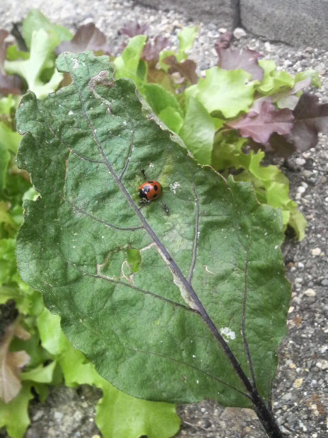 庭の片隅の家庭菜園で育てているナスの葉っぱの上にてんとう虫がいました。
