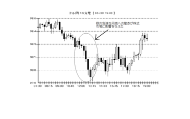 後場の調整は、シンガポールの日経先物が下落したことが引き金になったと指摘されていますが、実は昼ごろに円高が急速に進行したのが大きく影響したのではないかと見ています。