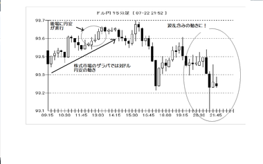 先ほどの「今日の株式市場を振り返る 7月22日」で用いる対ドル円レートのグラフ(15分足)をお送りします。 お手数ですが併せてご参照ください。