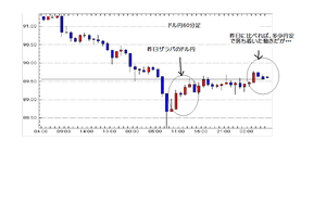 ドル円は、大幅な円高水準ですが、前日に比べれば僅かに円安に振れており、しかも落ち着いた動きに見えます。予断は許しませんが、とりあえずプラス要因です。