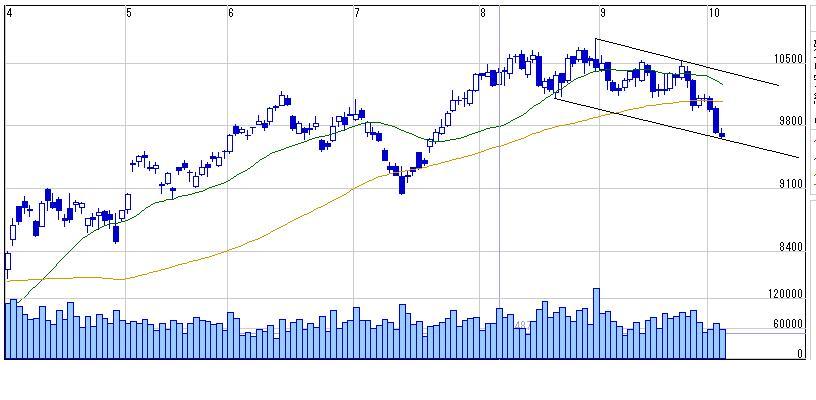 また、「4波のボトムが下値支持として抵抗をうけやすい」「出来高が下落時に増加しやすい」が基本 4波のボトム=9030 出来高の増加に注意しながら観察