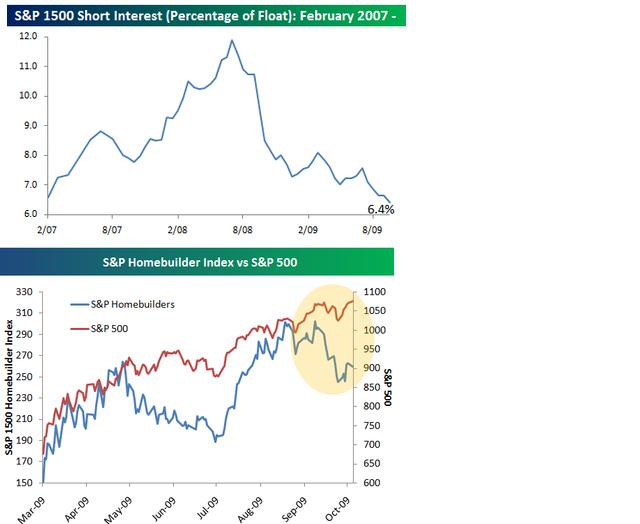 Last Friday, short interest figures for the end of September were released, and once again they showed declines. The average short interest as a percentage of float for companies in the S&P 1500 was 6.4%. This is now lower than any other point since at least the start of 2007. As shown in the chart, bets against the market have declined considerably since their peaks in 2008.