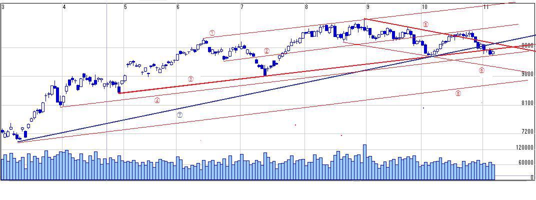 ・④を割れたら⑤-⑥の下落トレンドへ移行したものと考える。