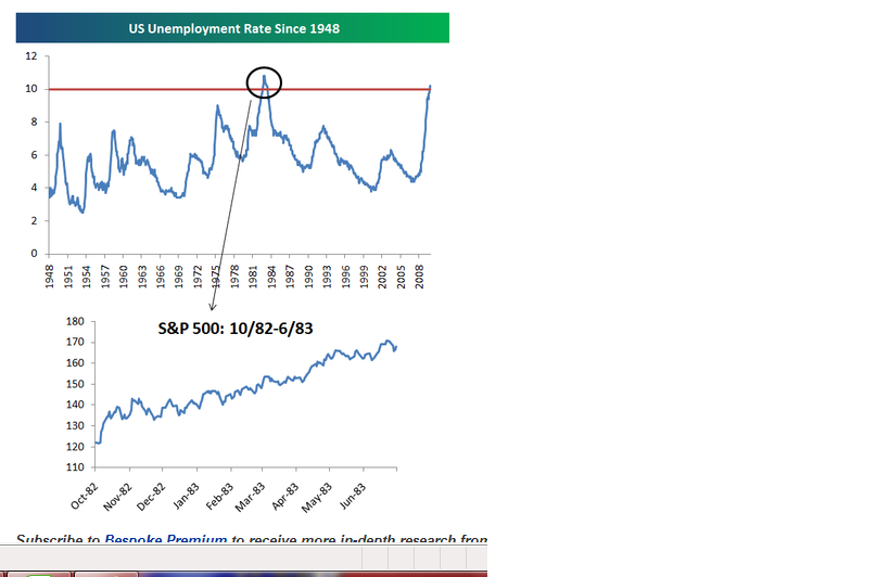 With the Dow opening lower today by about 50 points only to close up by about 20 points, investors didn't seem too worried about the move above 10% in unemployment. And they didn't seem too worried about it 27 years ago either. In fact, the S&P 500 went from about 120 to 170 (+40%) throughout the period of 10%+ unemployment from September '82 to June '83.