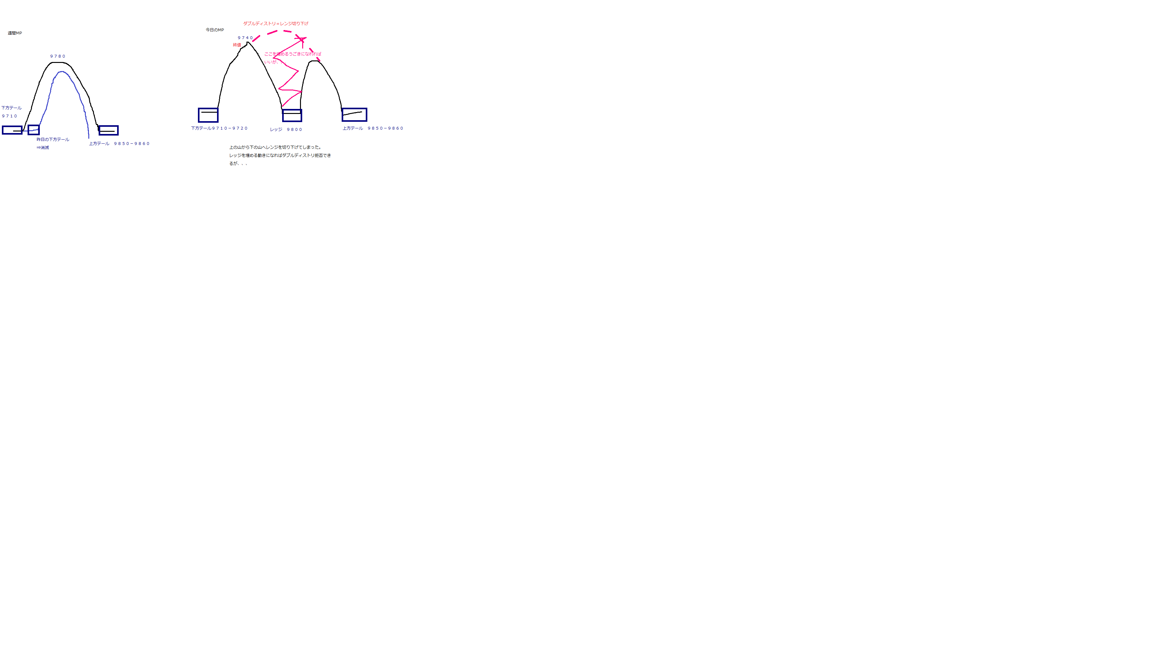 逆に上方テールをうめ、上方へのダブルディストリを形成できれば底打ちと判断できるかと思います。