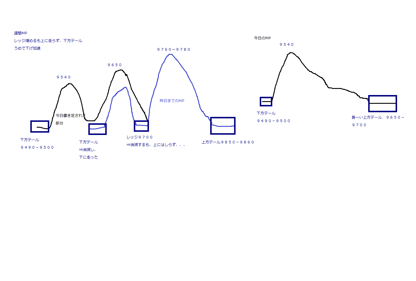 ・本日は新たに下方テールを9490-9500に作っていますので、ここもさらにうめきって下落してしまうのかに注目したいと思います。