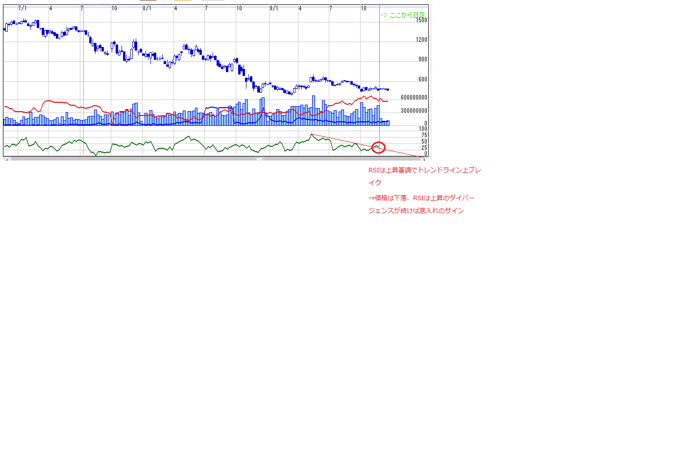 まずは①ダイバージェンス(価格下落でもRSI上昇)がおきてること、その上で②RSIを上ブレイクしてきたタイミングで買いに入ってます^^