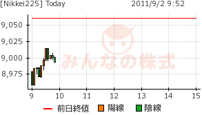 一旦上げるが、この後は下げ。午前引け値は8950円くらいか。問題は後場。下げ止まると見るが、日本は内閣の布陣が決まる日なので、それによって期待感が出ると、下げ止まりそうだ。が逆に失望感で下げ幅を拡大することがないとも言えない。また、ドル円が77円台になると来週への期待が高まるのだが。