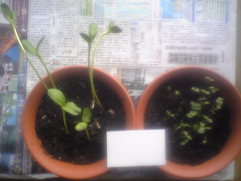 4/15ひまわりが伸びて、太陽の方向に伸びるので、反対方向に向けたら、10分後には元の方向に。まさに、向日葵という名前にふさわしい苗。