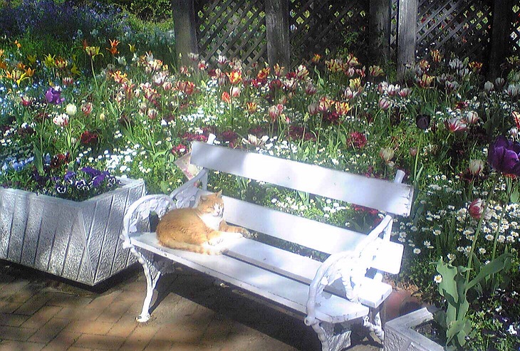 チューリップに囲まれ幸せそうな捨て猫ちゃん。