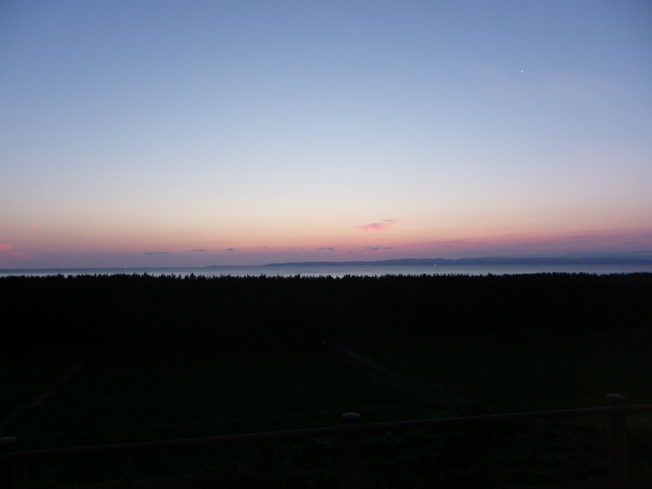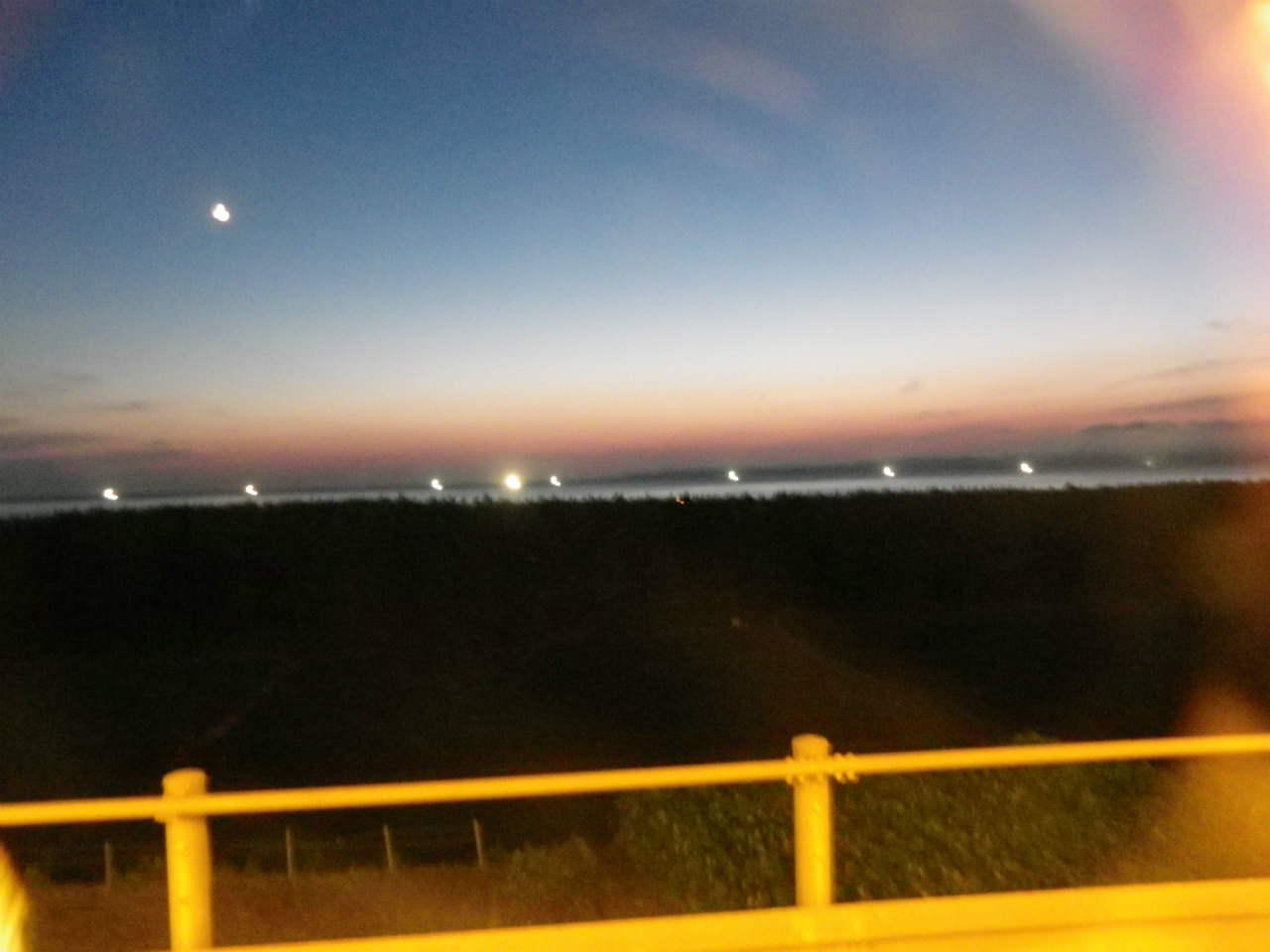 佐渡と夕日がガラス越しに見え、日が落ちると街路灯のような烏賊釣り船が並んでいます。。。