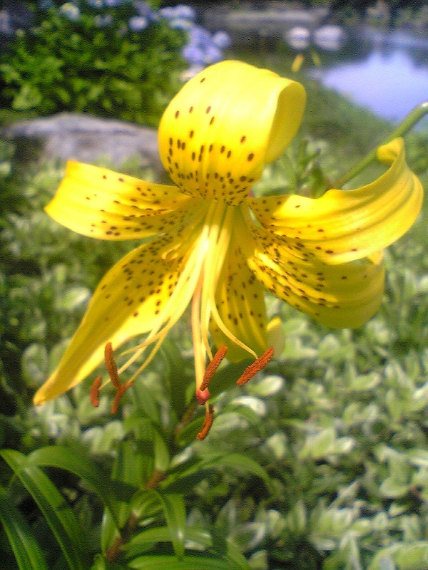 黄金鬼百合が白鳥庭園で咲いていました。鬼百合(黄赤色)の変種で、この黄色い色に咲きます。