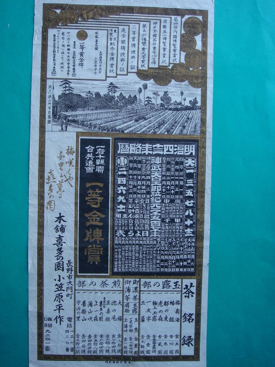 明治43年の「喜多之園」(長野市大門)の引き札に武州狭山自園図が描かれている。銅版で他は石版印刷である。茶名録では以前の名入りから自園別製「喜多之園」に変わっている。