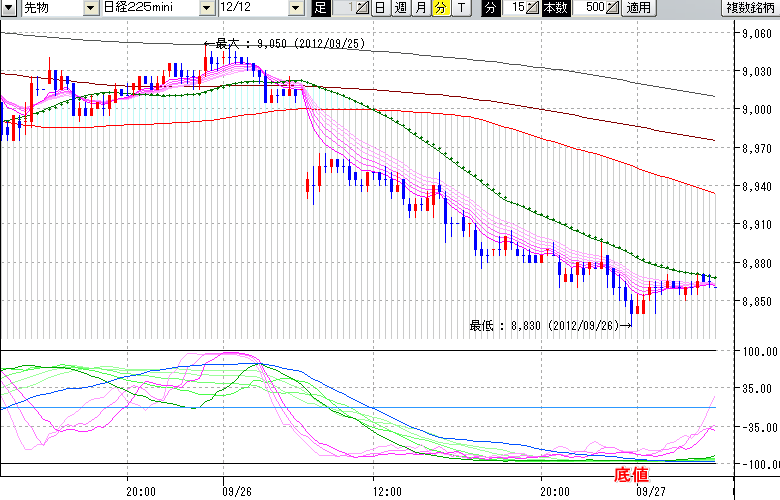 指標ラインの密集点が天底・転換点を示します。指標の見方