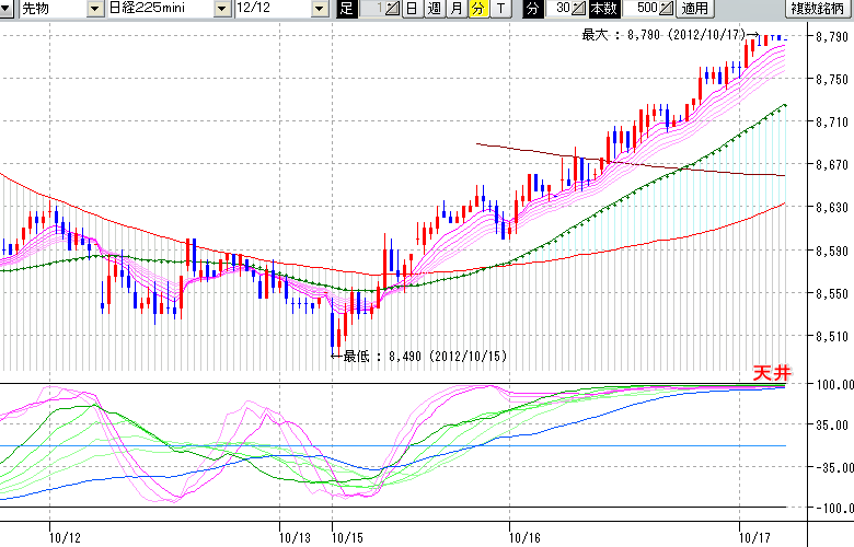 指標ラインの密集点が天底・転換点を示します。指標の見方