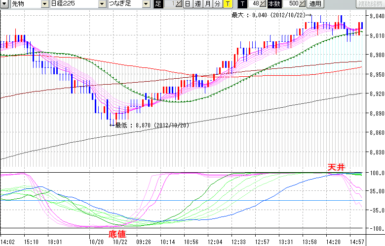 指標ラインの密集点が天底・転換点を示します。指標の見方