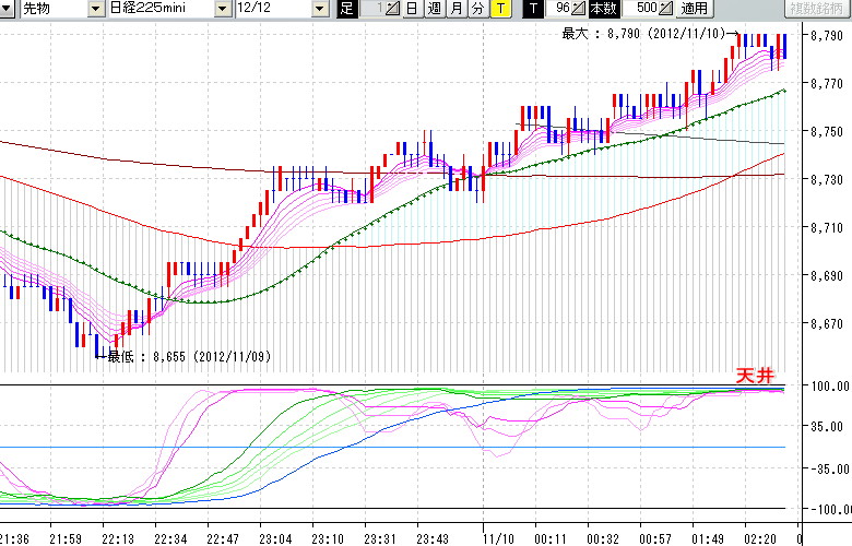 指標ラインの密集点が天底・転換点を示します。指標の見方