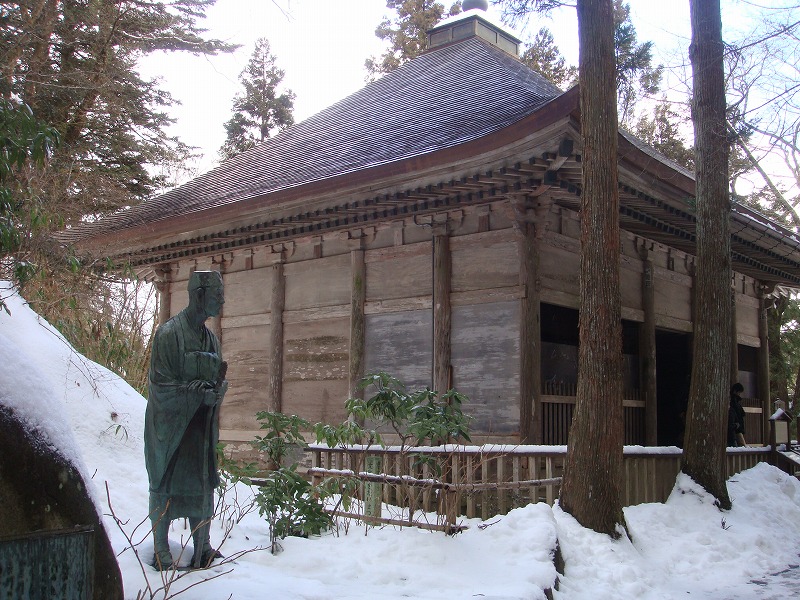 中尊寺本堂 松尾芭蕉像と金堂の旧覆堂