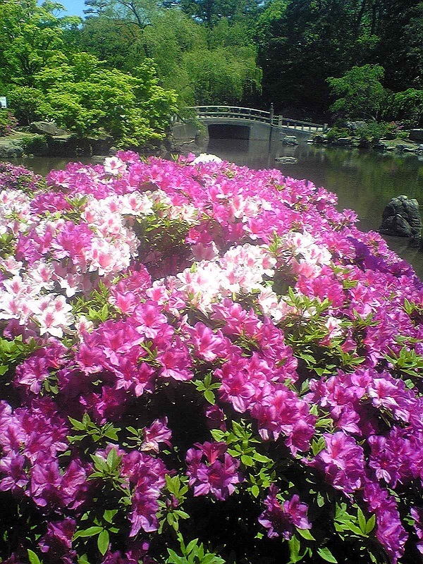 バックの緑と池と橋それに手前の満開のつつじの構図・・いい写真に仕上がってますね^^v