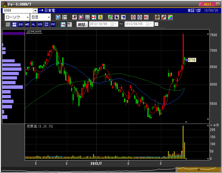 昨日引け直前にS高した日東電工は今日、早速の大幅安。