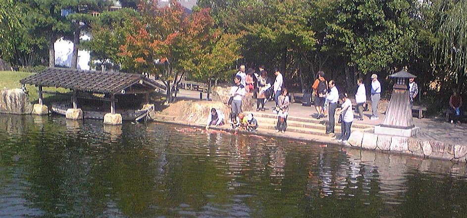 コイも子供も競争で餌やり。