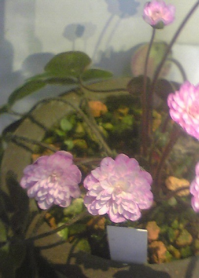 山野草展、盆栽の雪割草。可憐な花で、育てるのは難しい。