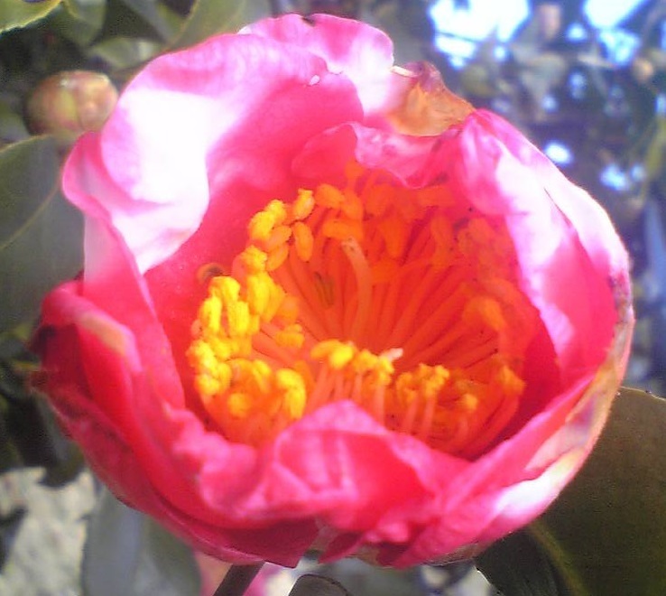 赤い花びらに白複輪、好い椿です。^^