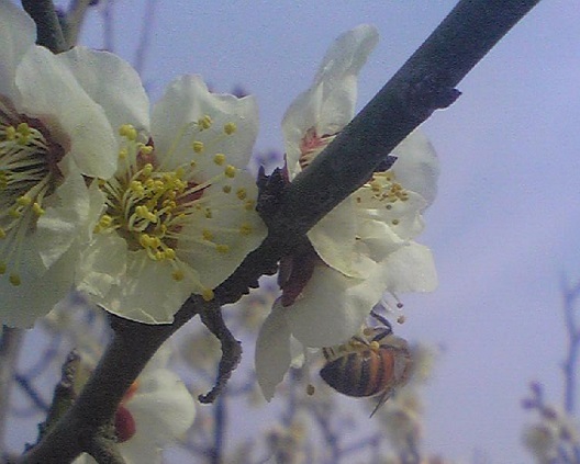 そうり梅です。18度で蜜を求めて、ミツバチが飛んでます。
