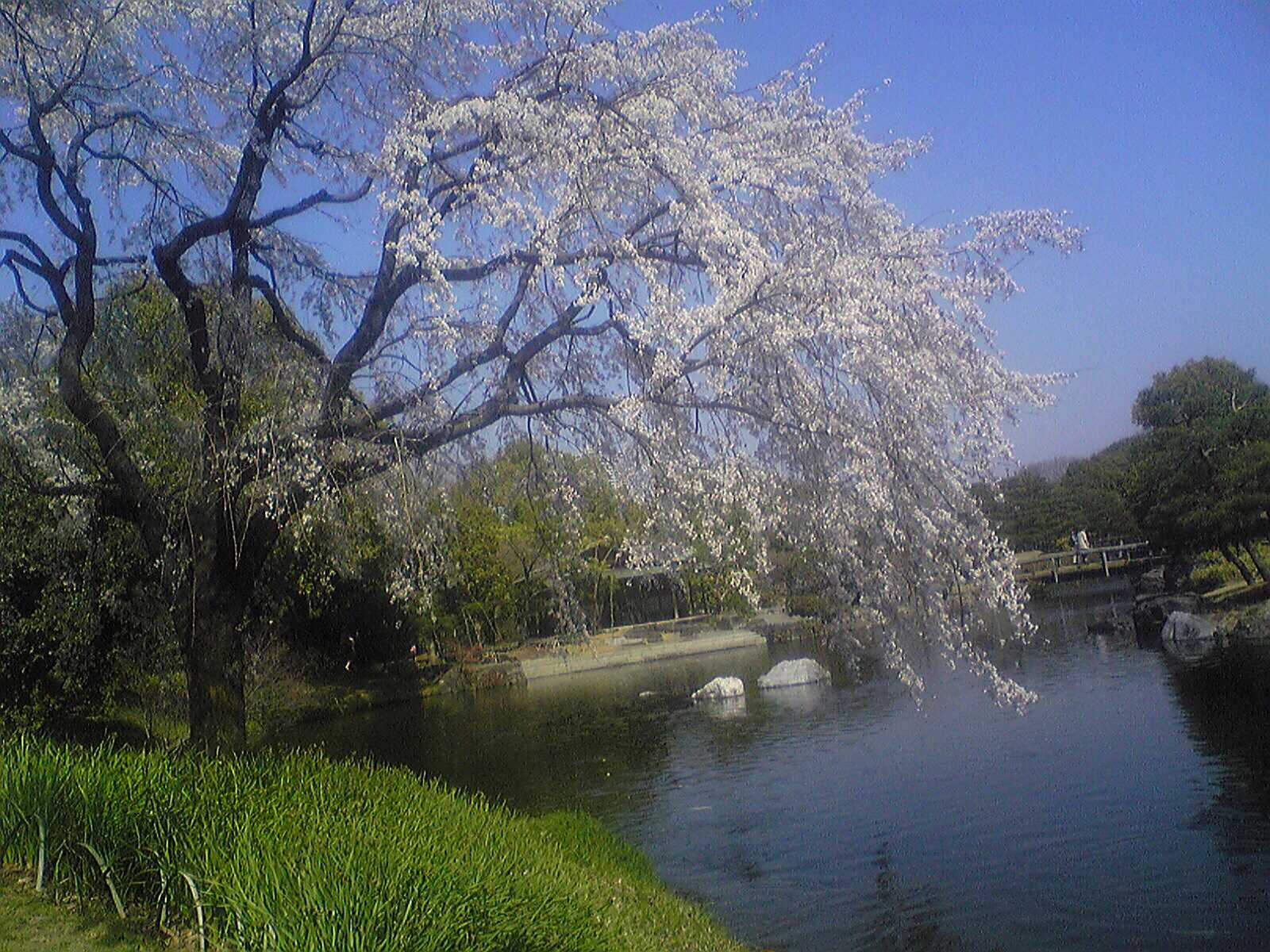 山桜も満開。白鳥庭園。午後になると鵜が戻って来て、運河に魚が来ているのだろうか?