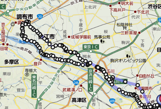 往路は環八~裏道~多摩堤通り~裏道~狛江通り、甲州街道まで出たら車がいっぱいなのでメゲてしまい、そのへんから適当に走って多摩川へ出てそのまま川沿いに走って帰宅。