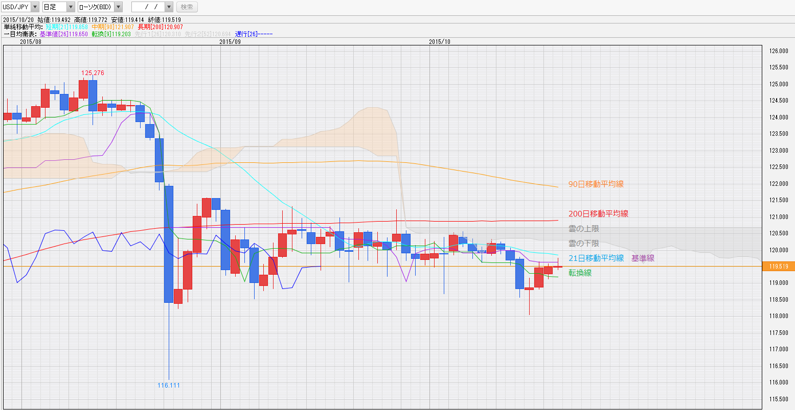 C:一目均衡表・週足雲の上限(118円73銭)がポイント。