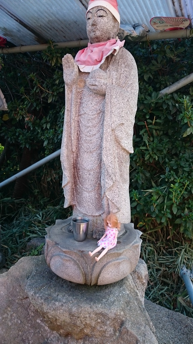 お地蔵さんの足元でちょこんと座っているりかちゃんがかわいらしいですね。