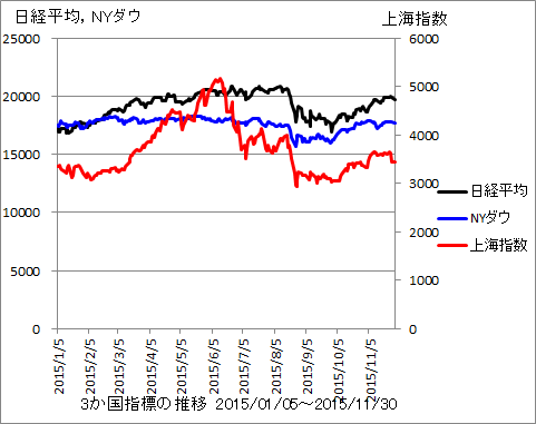 11月は、日経平均と上海は動きが近かったけど、NYダウが一人別な方に動いたと言えそうです