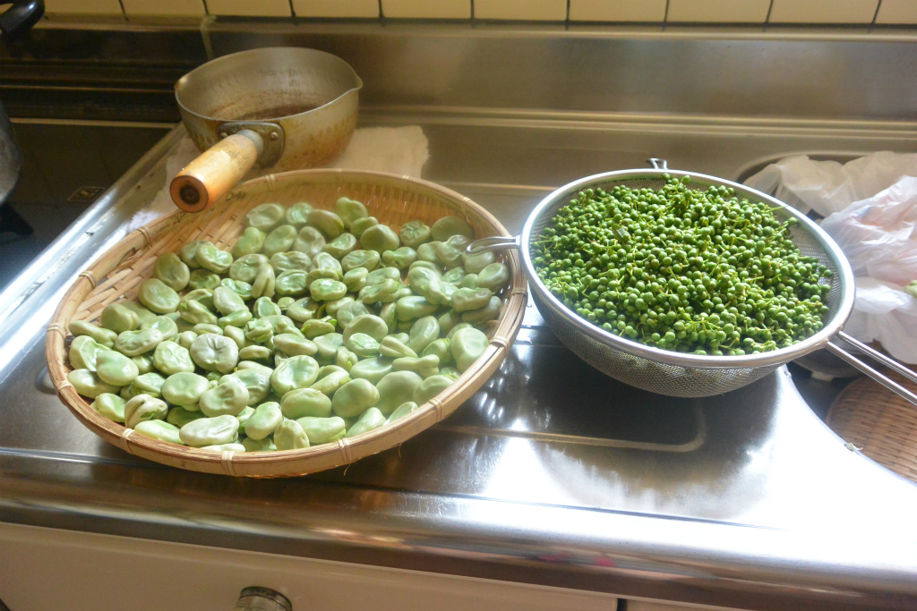 朝ご飯で大量のサヤエンドウの入った、、、というか、サヤエンドウの隙間におつゆが少々入った味噌汁と、スナップエンドウの炒め物、夜はサヤエンドウの味噌汁とスナップエンドウの天ぷらに、キュウリとレタスのサラダにそら豆と、、、まるで馬か牛のような食生活を送っています(T^T)ウッウッウッ