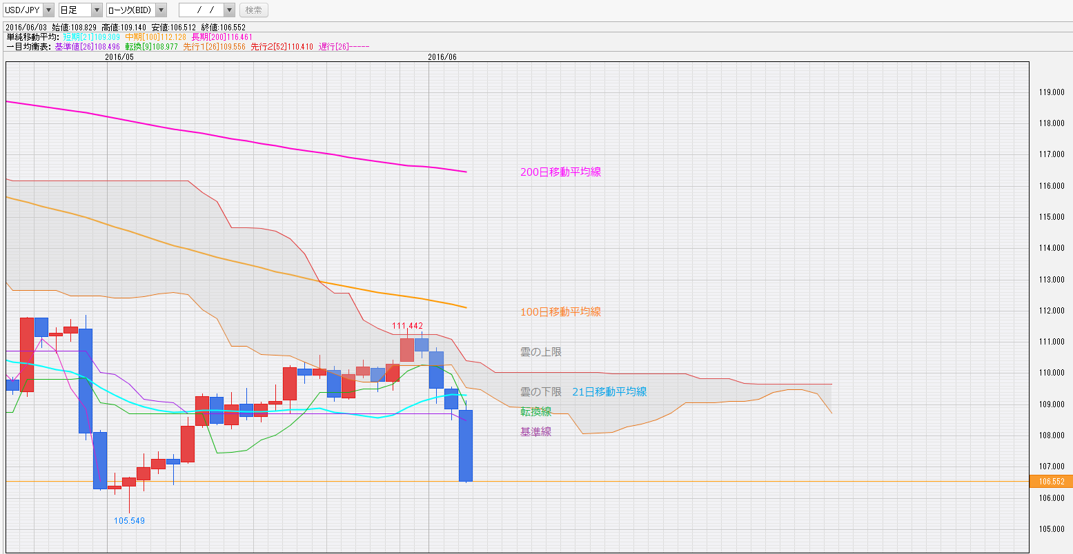 200週、200月移動平均線が並ぶ105円80銭