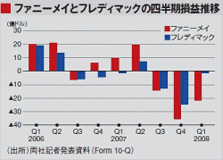 ただ、両社は2008年第1四半期まで3四半期連続で最終赤字に陥っている。保証するMBSへの引当金などの信用コストが1年前から10倍以上に急増しているためで、ファニーメイの60日以上の延滞率は4月現在で1.22%と、前年同期の0.62%から2倍に急上昇している。