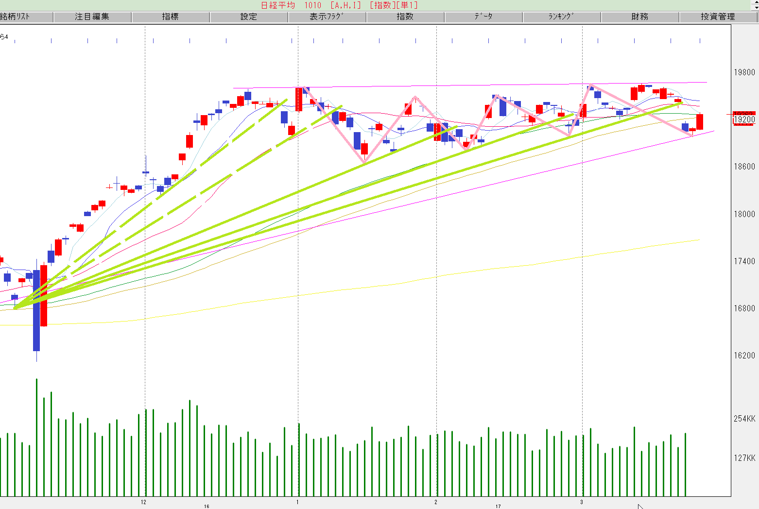 下のチャートに引いたラインは日足のファントレと山谷の形