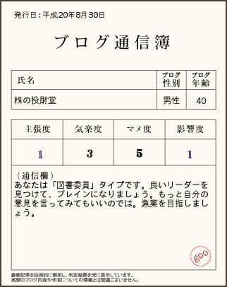 ブログ通信簿なるものをやってみた。何とも嘆かわしい結果が出て、しばし愕然。未だ愕然。