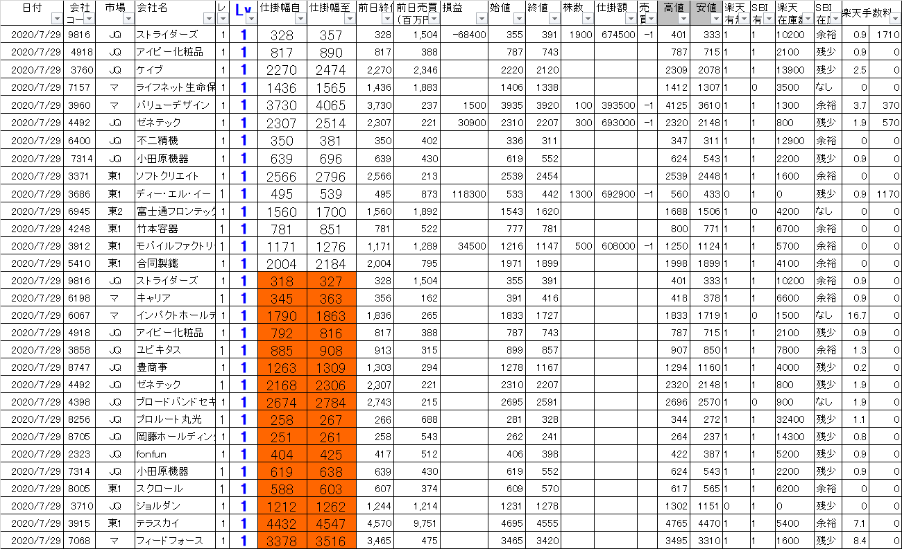 ※仕掛け表中の背景色がオレンジの行は【買い仕掛け】の対象銘柄で、データ収集のためのものです。(仕掛表について詳しくはこちらを)
