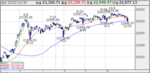 週明けに大統領選挙がありますが、大統領選挙のある11月3日は日本は祝日でもありますから、この下げは想像できたという感じですが…、23000円割り込んでズルズルとなると投資家心理は悪化しそうですね。