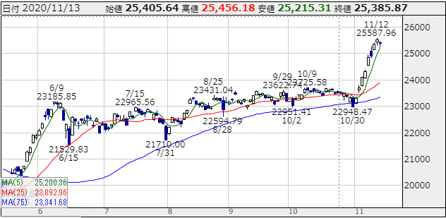 11月に入ってからの株価急伸…まさに昇竜の如く上昇を続けた日経平均株価ですが、日経平均は2日から12日にかけての8連騰で、2543.75円の上昇幅を記録ですからね。