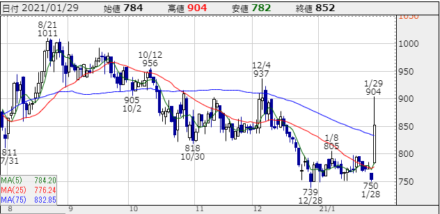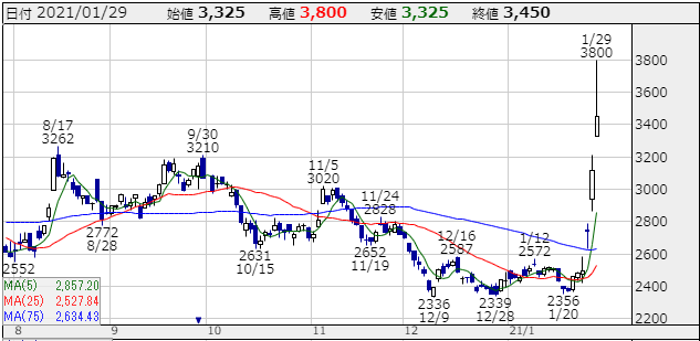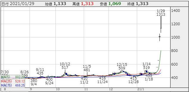 時価総額が小さい銘柄に一気に買いが注文が入ったわけですが、たった4日で株価3倍ですからね!こういう銘柄を本当手にしたいという感じですよね~。