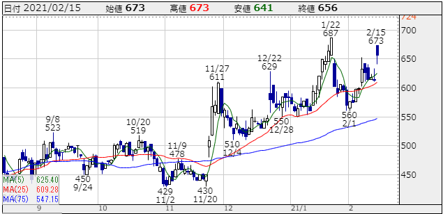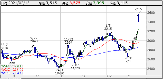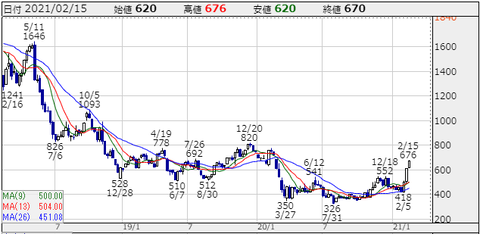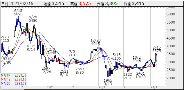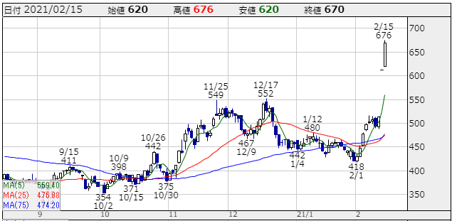 2月10日に2021年3月期の連結業績予想を増額修正した事で決算後にSTOP高となりましたが、その内容は、営業利益は従来予想の「6億円から60億円」に上振れ、最終赤字は同54億円から25億円(同138億0400万円の赤字)に縮小、営業利益の従来予想からの修正率の大きさが注目されたとの事です。
