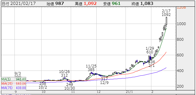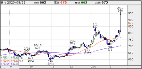 寄り付き813円からグイグイと上昇を続けて、後場には高値960円までの上昇ですよ!