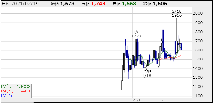 逆指値いれてたからいいですが、2月16日高値1956円から昨日は終値1606円ですよ!波が荒すぎです(怒)